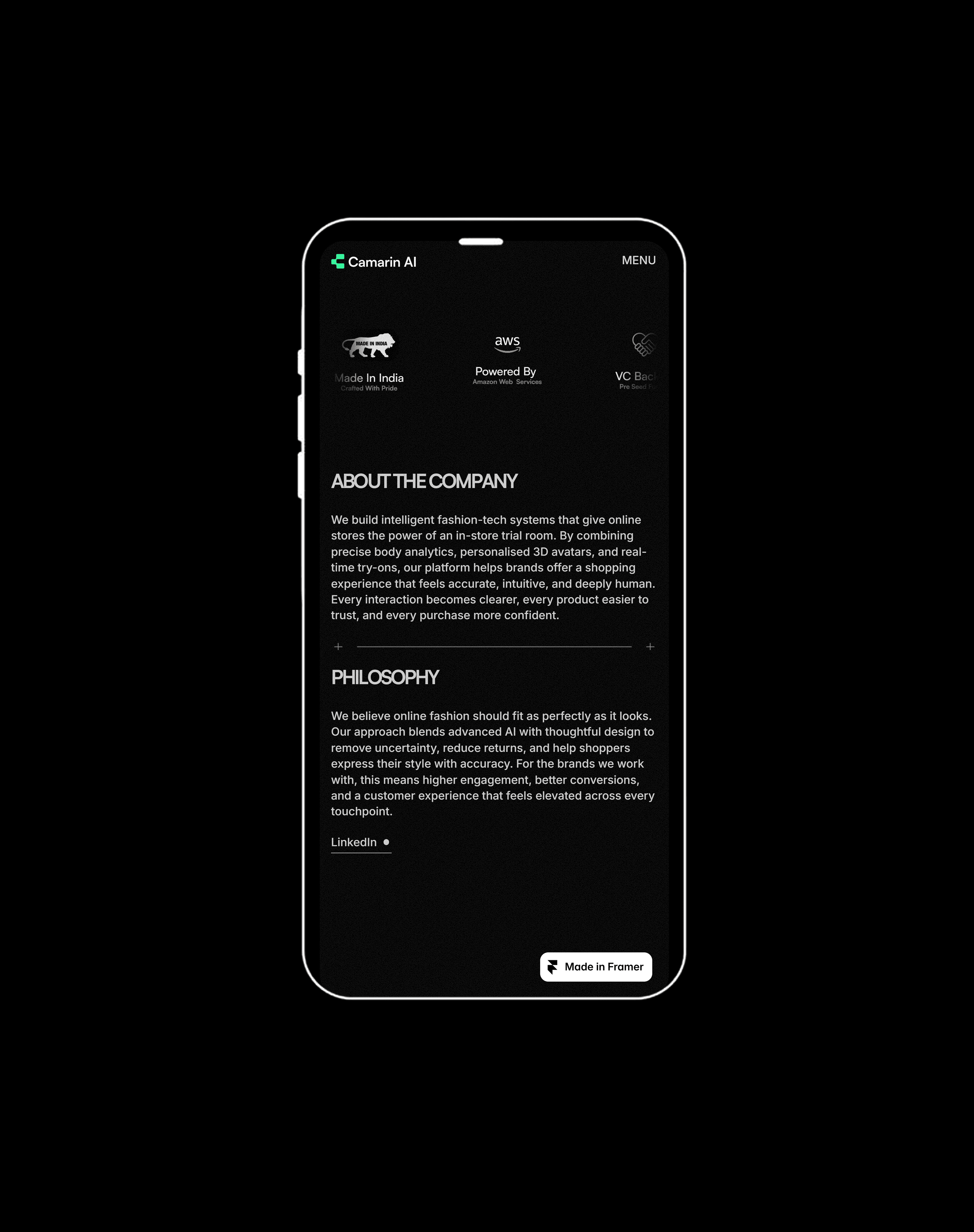 Our approach was to create a storytelling-driven website that balances product clarity with visual depth. We designed custom assets, structured the user journey around real business outcomes, and developed a fast, high-performance site in Framer helping position Camarin AI as a forward-thinking technology partner in the fashion ecosystem.
